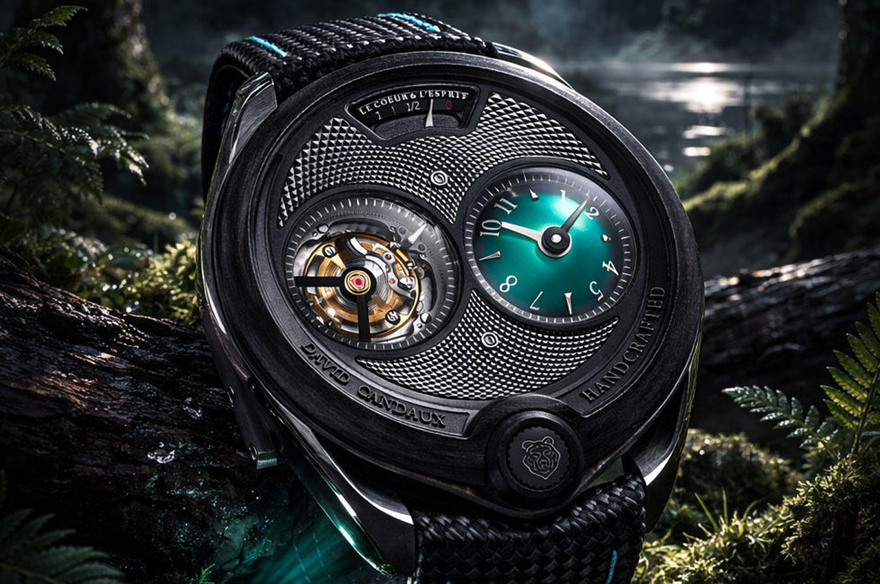 From every angle, every view and every touch, the David Candaux DC6 Night Forest watch has been crafted to stir the aesthetic senses. The use of unidirectional carbon on the caseband and bezel gives the piece an immediate organic feel, with the wholesome texture of the cutting-edge material recalling natural wood grain. Clasped within cleanly defined titanium brancards which extend to the elongated lugs, the basin-shaped case profile remains unbroken due to the ingenious ‘magic crown’ placed at the 6 o’clock. Sized at 45mm diameter, with a height of 11.29mm, the housing incorporates a sapphire crystal caseback and weighing only 45 grams, it boasts an impressive water resistance of 50 metres.