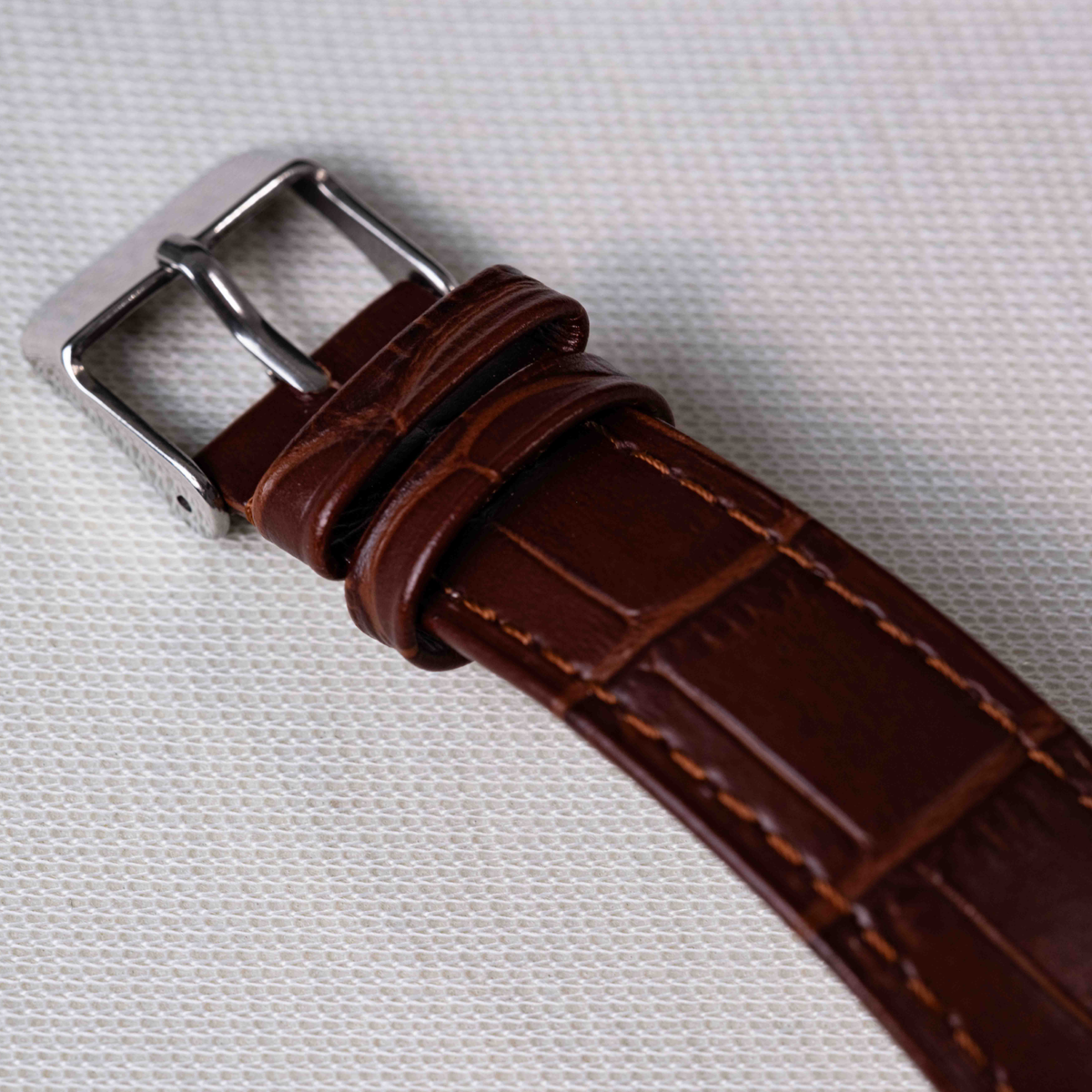 Notably, this piece remains in entirely authentic condition, with no refinished components or replaced parts. The case exhibits signs of wear consistent with its age but retains its vintage charm and integrity. Fitted with a brown leather strap and traditional buckle, the watch has a ...