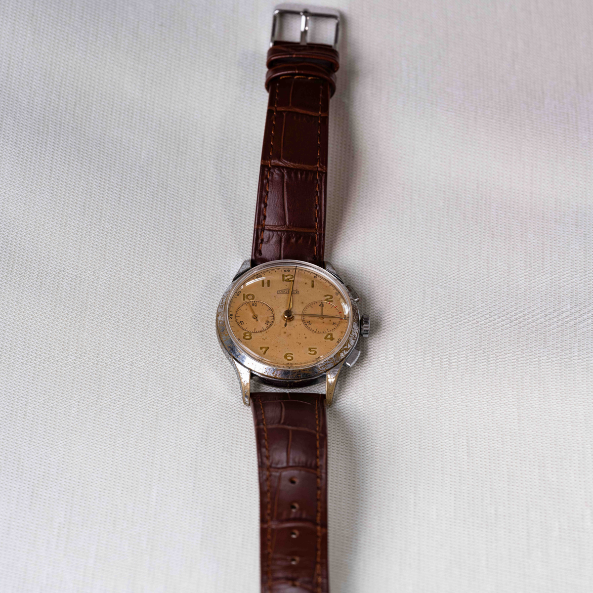Vintage Angelus chronograph from the 1950s stands as a testament to the brand’s historic mastery of mechanical watchmaking. Powered by the celebrated in-house Angelus Calibre 215, this manual-winding movement features 17 jewels, a 32-hour power reserve, and was recently serviced to ensure reliable performance. The watch features a 37mm x 45mm oversized stainless steel case with a thickness of 13mm, offering presence on the wrist without compromising elegance. Its original champagne dial is beautifully preserved, showing light, even patina, with golden Arabic numeral hour markers and slender, original hands. The small seconds subdial and chronograph function remain crisp and fully functional beneath the domed plexiglass crystal.