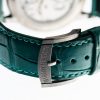 Most striking of all is the mesmerising pattern of guilloché decoration which is engraved deep into surface of the dial’s central panel. Available in options of black, green, grey, burgundy, blue, or salmon, its overlapping rings swirl outwards from the centre to create an intense ripple effect which plays with the light and irresistibly catches the eye. Machined by hand using traditional guilloché rose engine, it is outstandingly accomplished.