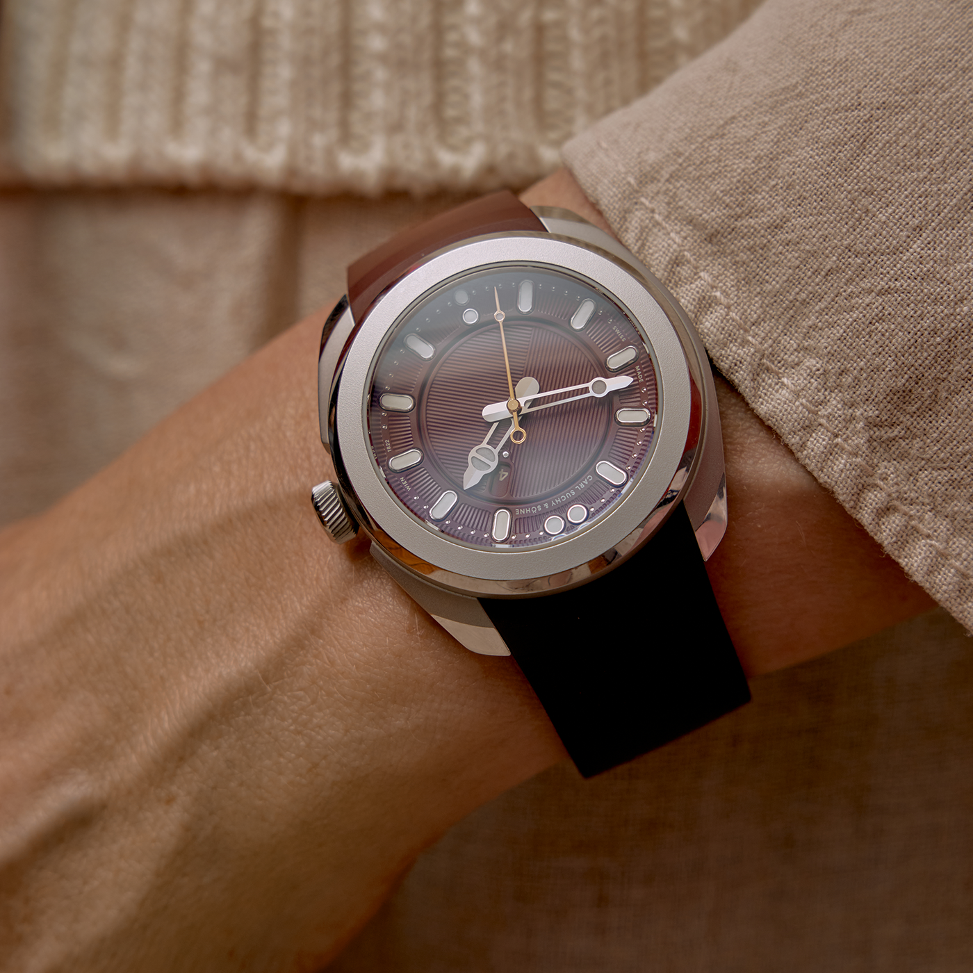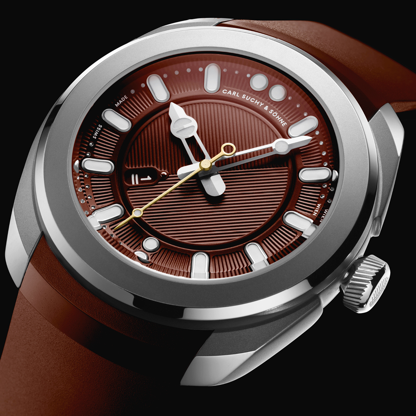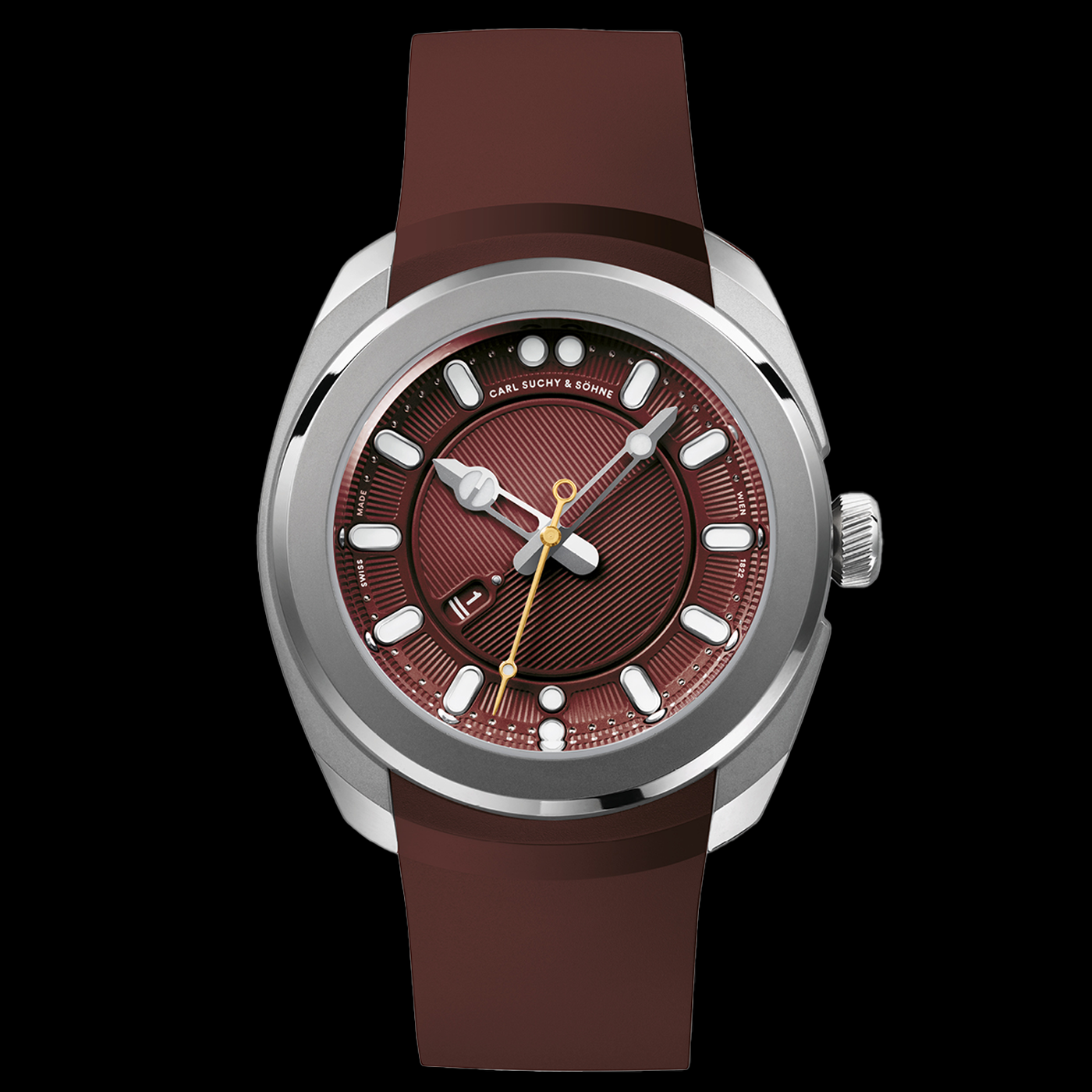 Featuring sports aesthetics and elegant styling codes, the Belvedere Bordeaux by Carl Suchy is a beautifully executed timepiece. Inspired by the architecture and ambience of the iconic Viennese Belvedere Palace, the design language of the model draws from the legacy of this significant historical watchmaking name and it exhibits the quintessential charm which one can find only in Vienna. Crafted with the technical input of acclaimed master watchmaker Marc Jenni, the Belvedere has a unique date display window that transforms the aspect of the deep burgundy tone dial every 24 hours, and the model is presented in a pearl-blasted and polished 40.8mm stainless steel case, with the sapphire caseback revealing the automatic winding Carl Suchy CSS201 movement.
