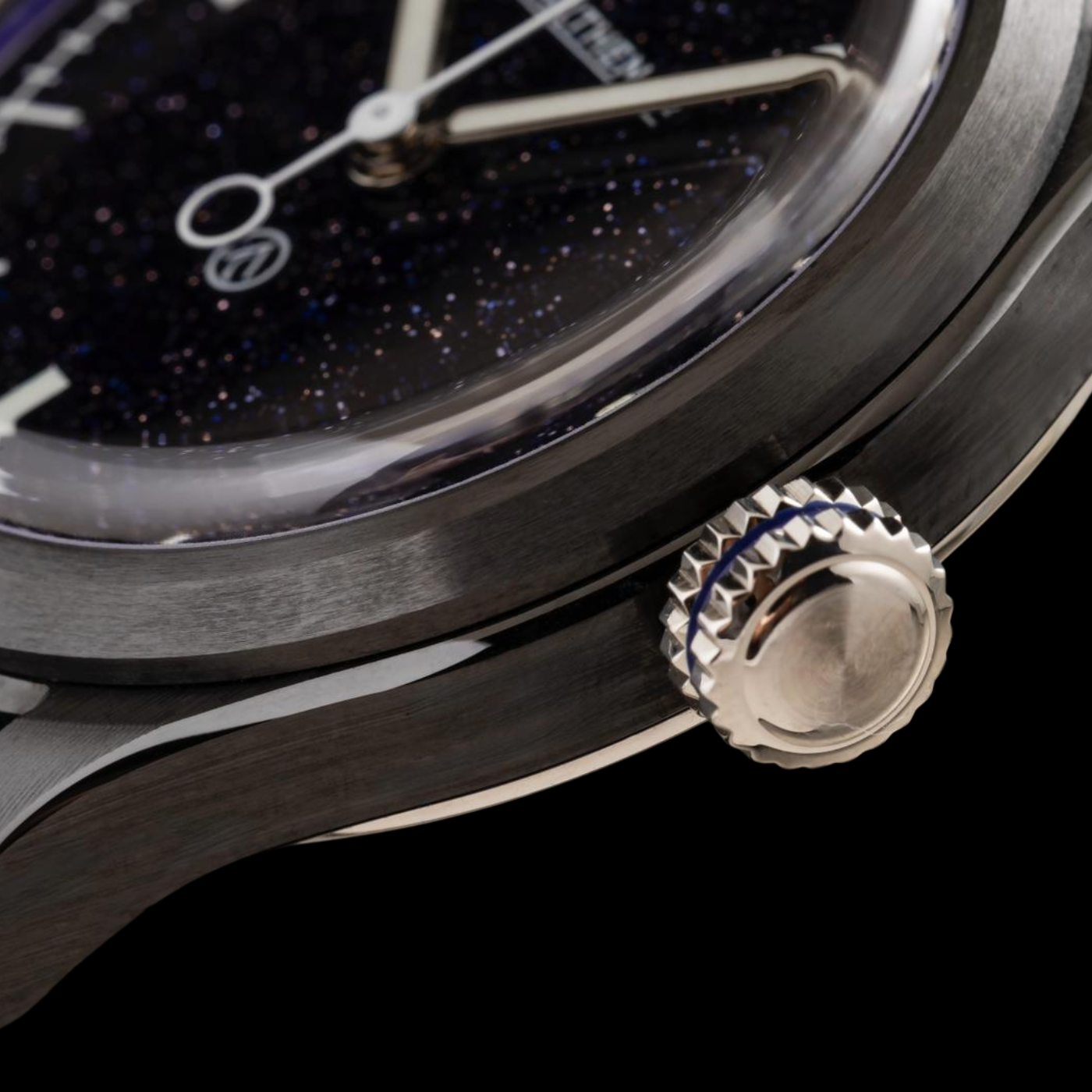 Constructed from aventurine, the surface is infused with metallic flecks that replicate the depth and sparkle of a night sky. It shifts constantly depending on light, turning a simple three-hand watch into something far more dynamic on the wrist.