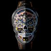 Fiona Krüger Petit Skull Celebration Enigma watch. A Swiss made wristwatch by independent watchmaker Fiona Krüger, in a skull-shaped case of matte black PVD coated stainless steel measuring 34.5mm (W) x 48mm (L), presented on a hand stitched leather strap with pin buckle. Limited edition of 18 pieces with Dia de Los Muertos theme, featuring three layer dial with hand painted lacquer, openworked eye, nose and teeth apertures, and Super-LumiNova detailing. Steel caseback with sapphire panel revealing skeletonised Swiss Soprod M100 self winding movement featuring guilloché rotor, and 42 hour power reserve.
