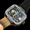 A skeletonised dial exposes the in-house calibre A82, appearing suspended between two sapphire crystals. The architecture is open and technical, prioritising depth and mechanical visibility over traditional finishing styles.