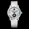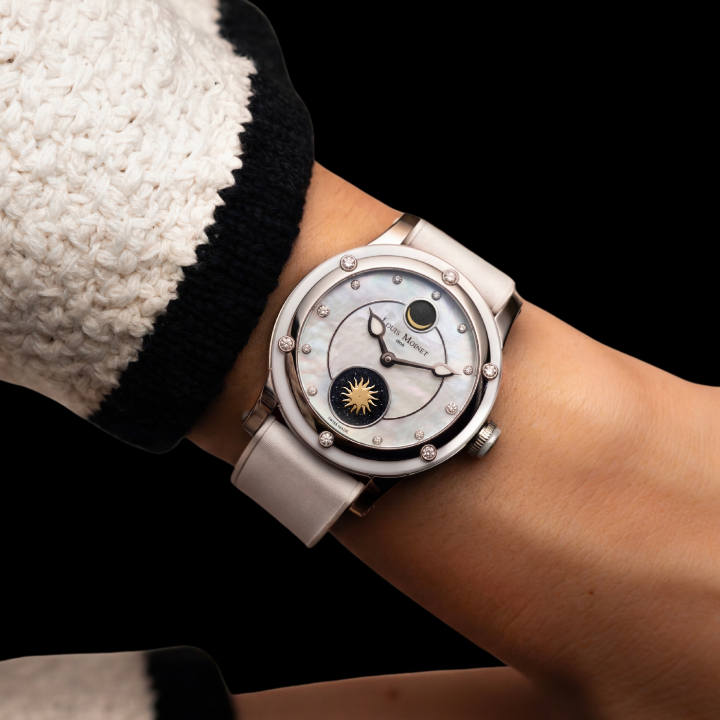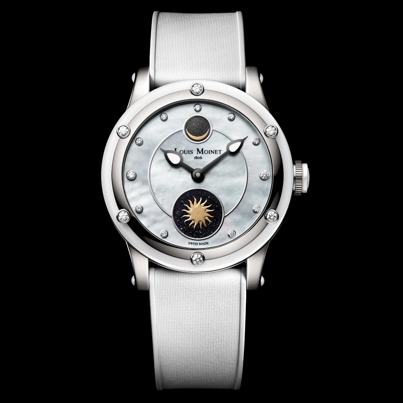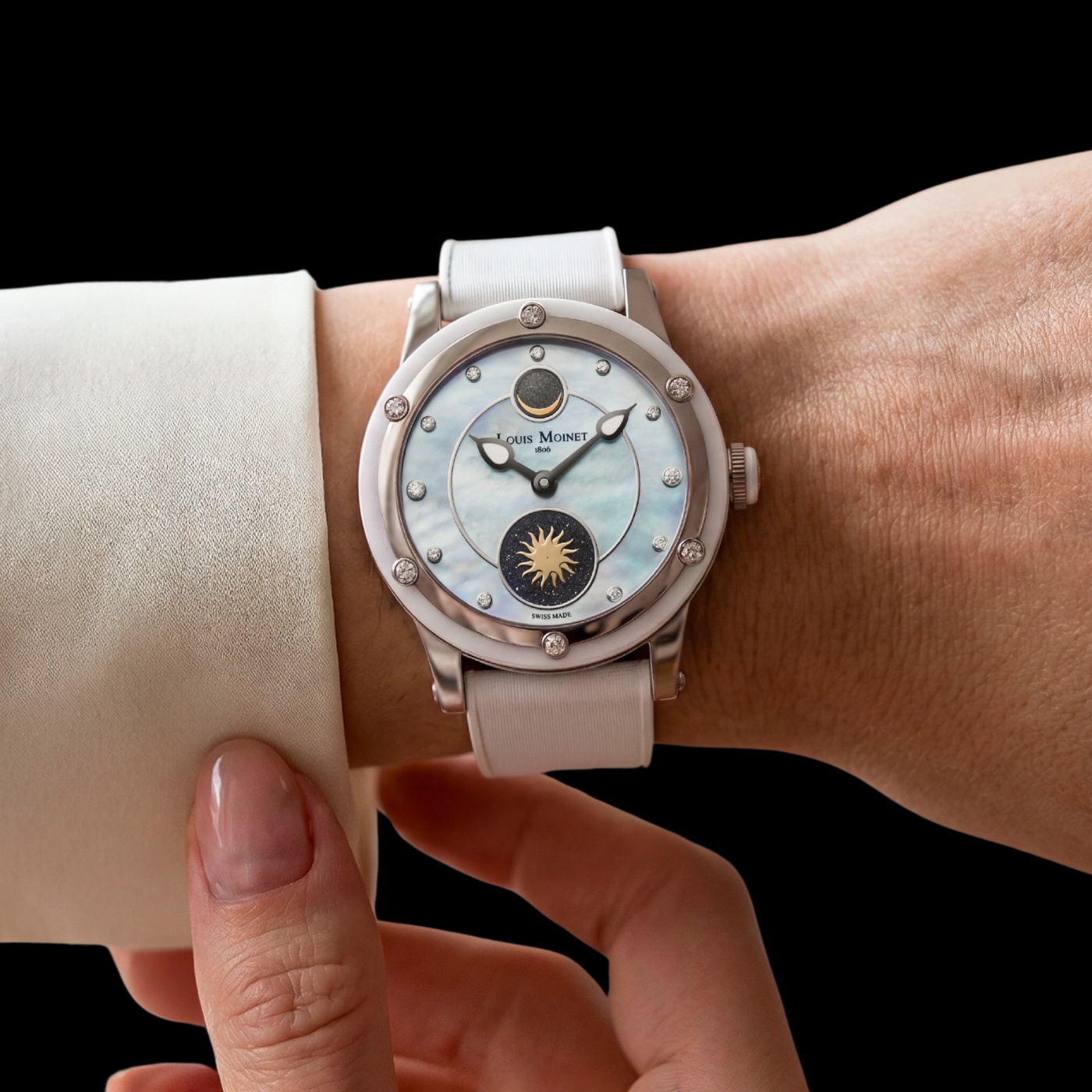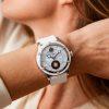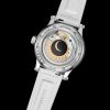 Where Nightfall leans into stealth, Moonglow introduces contrast. A white ceramic case frames the aventurine dial, amplifying the sparkle and making the star-like effect more pronounced in daylight.