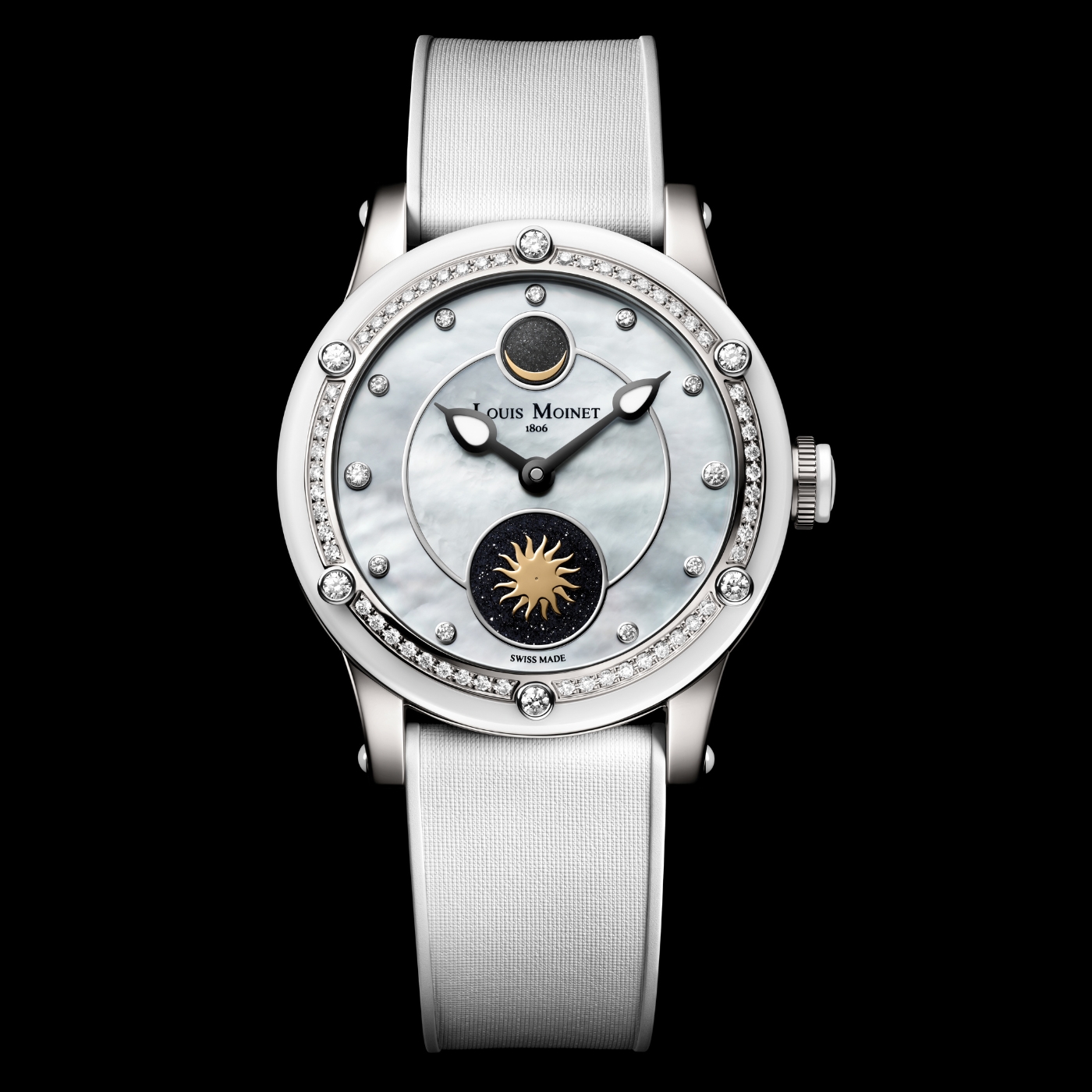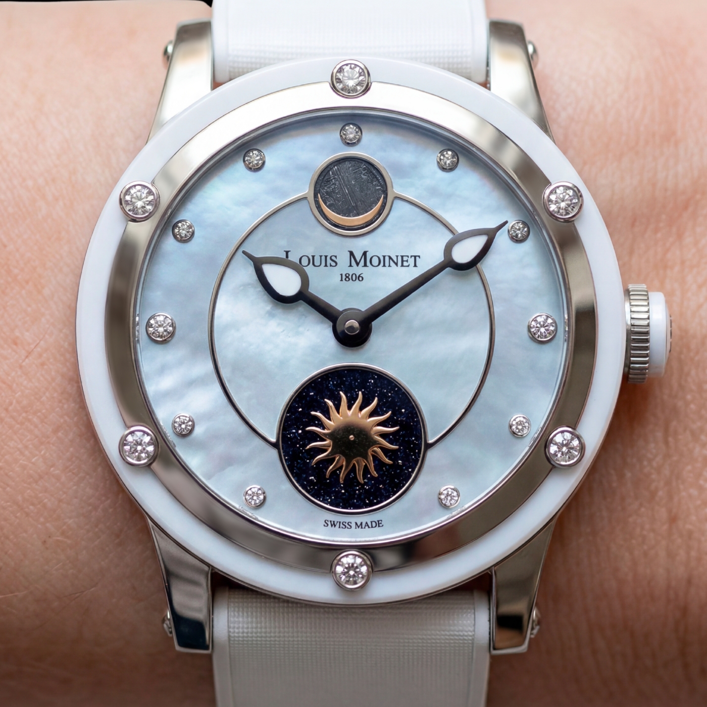 A celestial composition combining lunar meteorite, aventurine, and rotating sun animation within a refined, diamond-set case.
