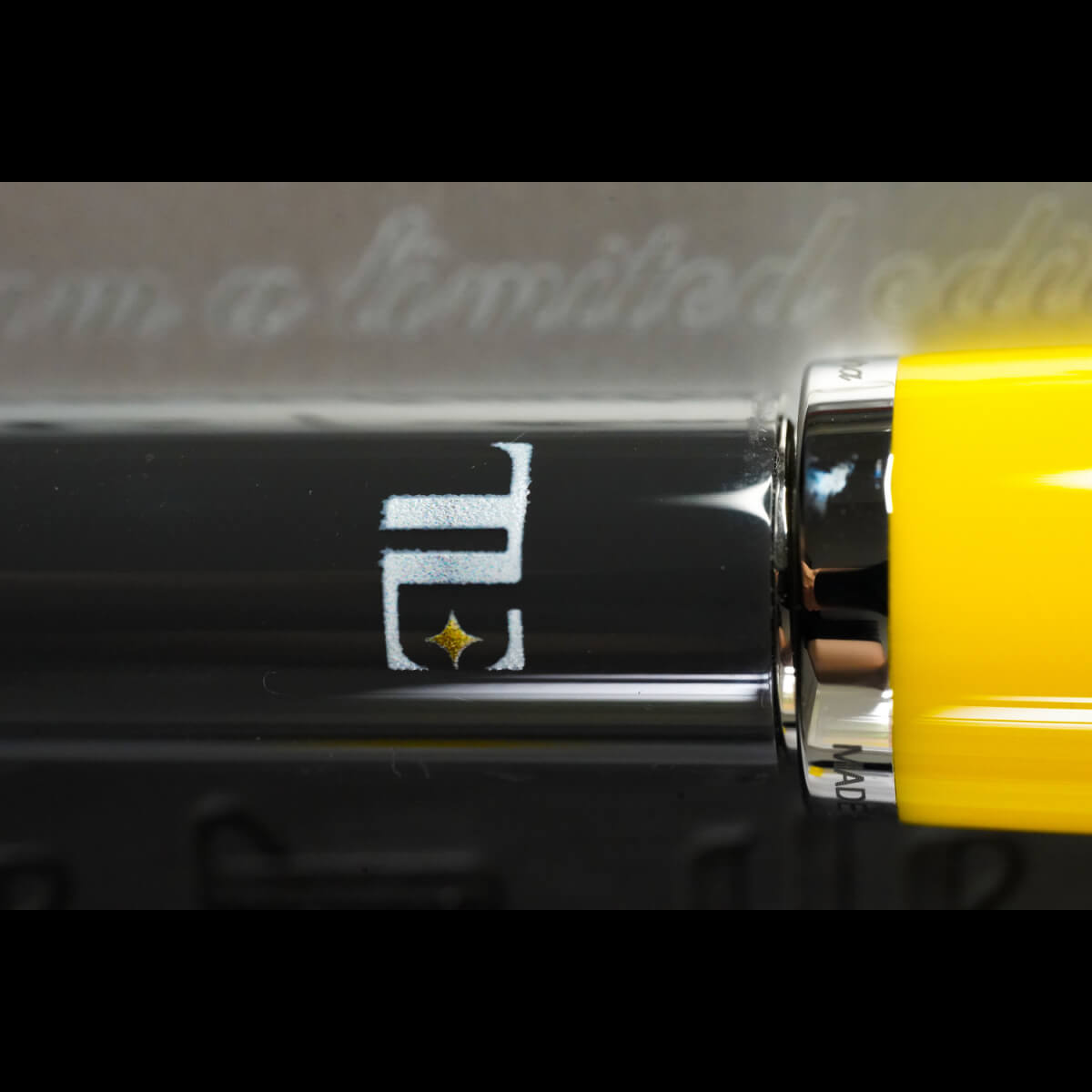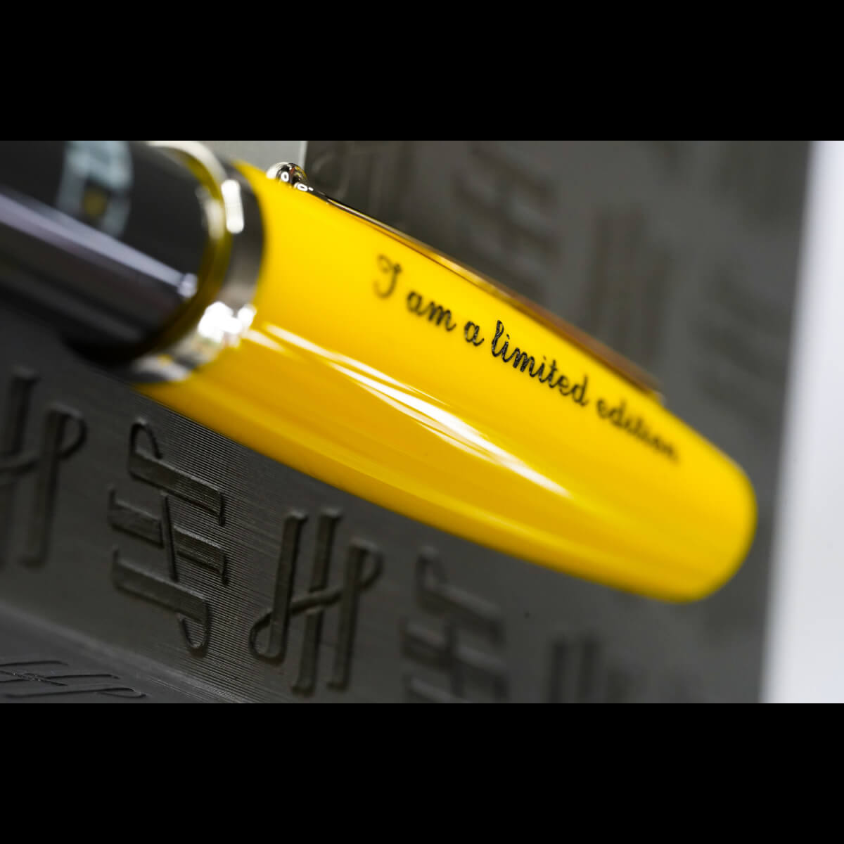 Featuring a unique mix of colour tones with vibrant yellow at the upper, tapering to a black chamber and nose, the curvature of the profile is enhanced, and it bears an elegantly scripted declaration “I am a limited edition” together with the logo of The Limited Edition, rendered in white with a golden star.