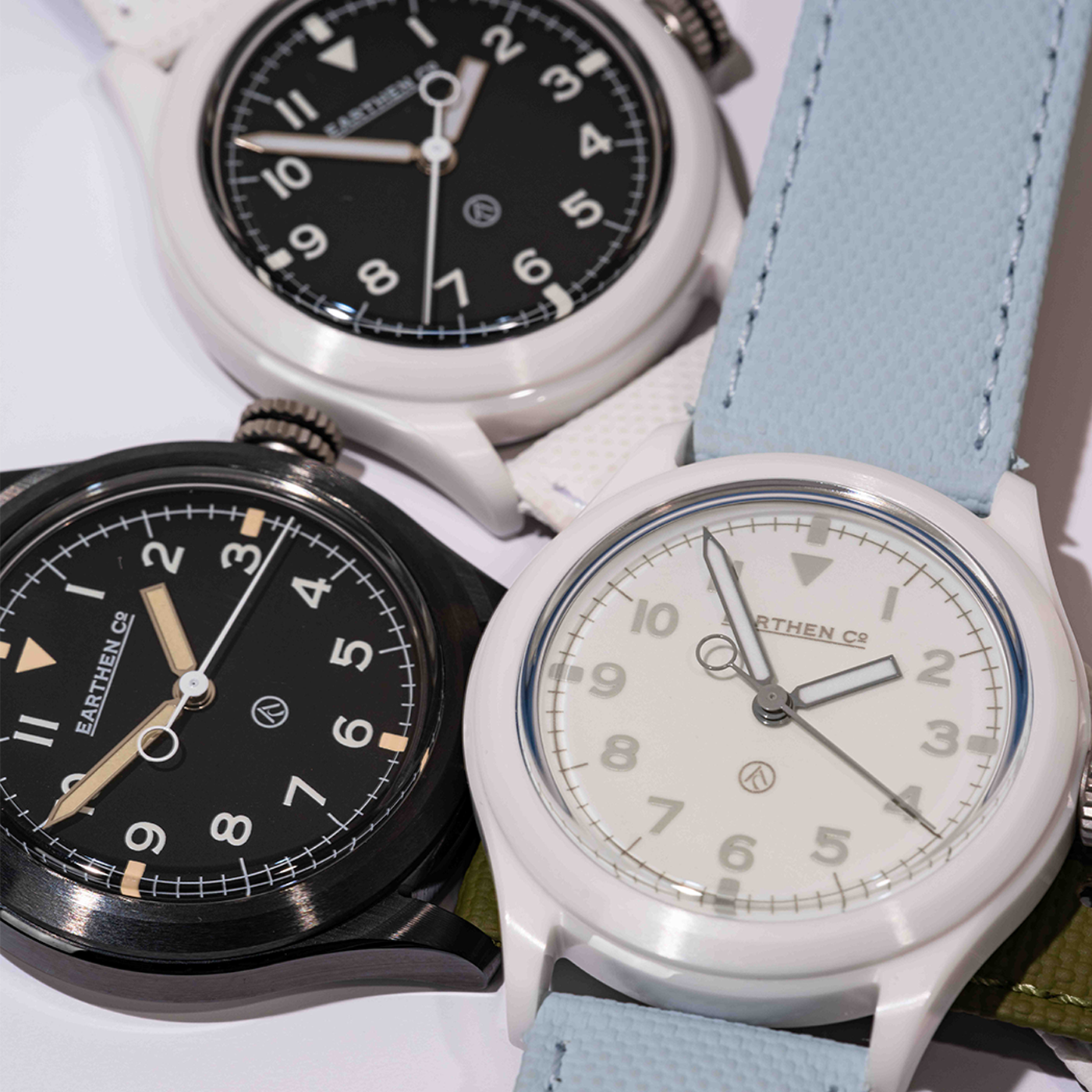 Blending vintage flair with high-tech materials, the Earthen Company Summit Whiteout watch will be equally at home either on the ski slopes or beneath a tailored cuff. Encased in a silky smooth white ceramic case that promises supreme scratch-resistance, the model has perfect proportions of 38mm diameter with a height of only 9.9mm, while an oversized crown ensures easy access. Circular brushing enhances both the crown and the caseback while inside, the superb Miyota 9039 automatic mechanical calibre beats at a rate of 28’800 vib/h offering a power reserve of 42 hours. Evocative of classic pilots watch styling, the model has a cleanly styled black textured dial on which the numerals, hands and minutes track offer excellent contrast, while the sporty character of the piece is underscored by a graphic depicting an Alpine skier’s descent. A superb proposition that offers the client a durable ceramic cased piece at a price point rarely seen, the Summit Overcast watch wears on a white sailcloth rubber strap and a navy NATO strap.