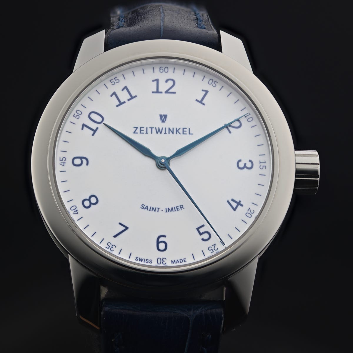 Zeitwinkel 082º Email Grand Feu wristwatch. A luxury Swiss made watch by independent company Zeitwinkel in a 39mm stainless steel case, and presented on ethically sourced calfskin leather strap with folding clasp. White grand feu enamel dial featuring blue enamel numerals and blued steel hands, the numerals on the dial uses Zeitwinkel own typeface. Sapphire case back revealing in-house ZW0102 self-winding movement with 4hz frequency (28,800 vib/hr) and 72 hour power reserve.