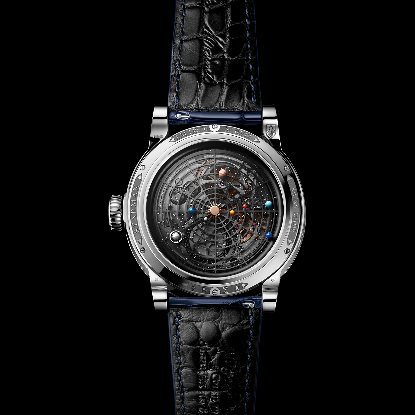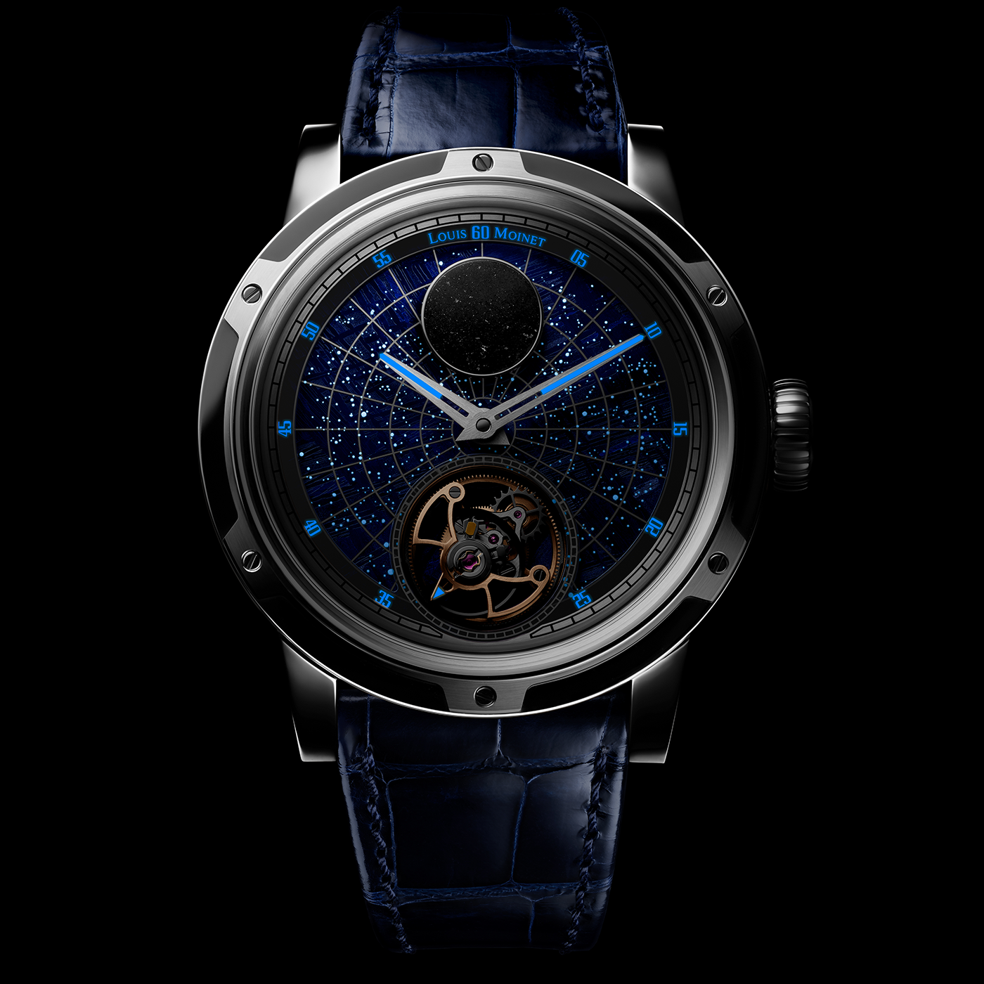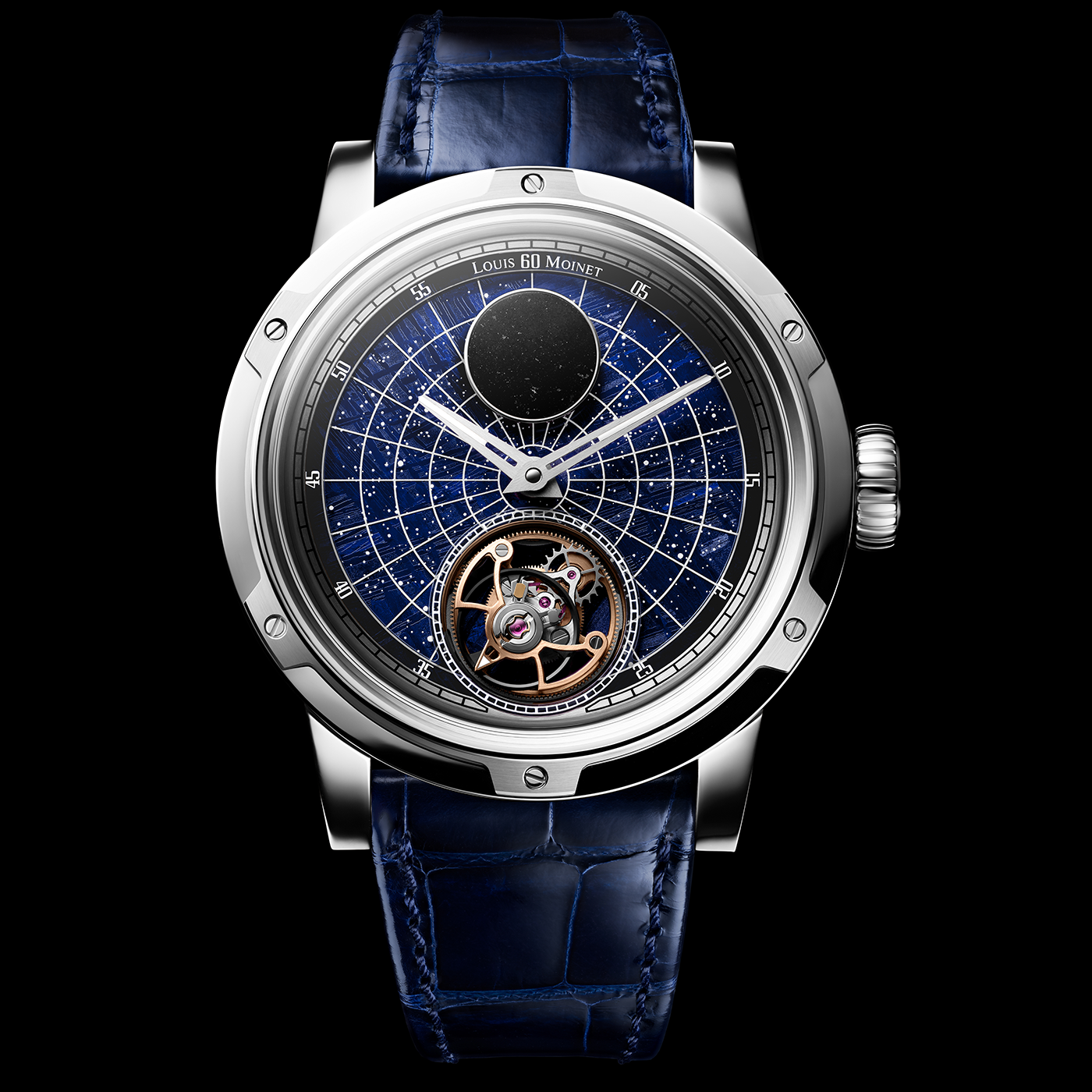 ?>A timepiece of unprecedented rarity and prestige, the Louis Moinet Starman White Gold watch boasts a multi layered dial featuring a blue tinted Gibeon meteorite base, with a sapphire disc decorated with luminescent hand painted constellations, complemented by a Jbilet Winselwan meteorite sample and a fully exposed flying tourbillon on the dial side. Presented in an 18ct white gold 47.4mm case with a decorative hand painted chart of the solar system on the reverse side, the watch is powered by a Manufacturer manual winding calibre featuring volte face double barrels enabling a 96 hour reserve of power. This extraordinary model will be strictly limited to only 12 pieces.